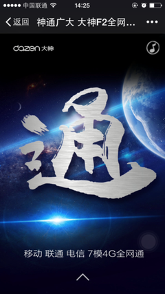大神将会在明天再北京举行发布会,发布全新的大神F2全网通版,大神F2全网通版是首款千元八核全网通手机,支持电信、移动、联通 三大运营商的4G、3G、2G网络,售价1199元。