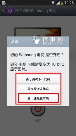 11、确认电视机是否开启,若已开启,请选择【是,该代码可用】。若未开启,请尝试重新发送代码或测试下一代码,如下图所示
