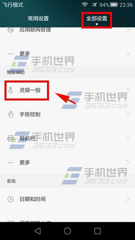 1)打开华为荣耀6手机【设置】点击【全部设置】,在智能辅助中找到【灵犀一指】,开启【灵犀一指】功能。(如下图)