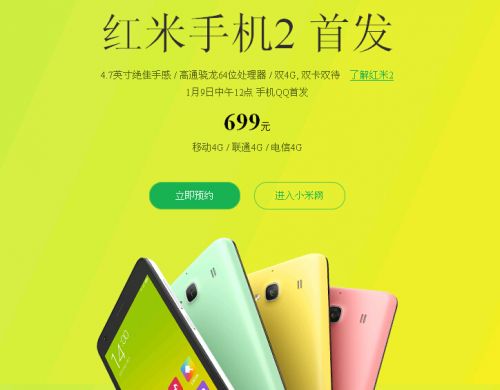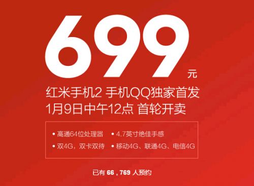 目前红米2已经开启了预约,将于1月9日中午12点在手机QQ独家首发开卖,售价为699元,有兴趣的朋友可以开始预约了。