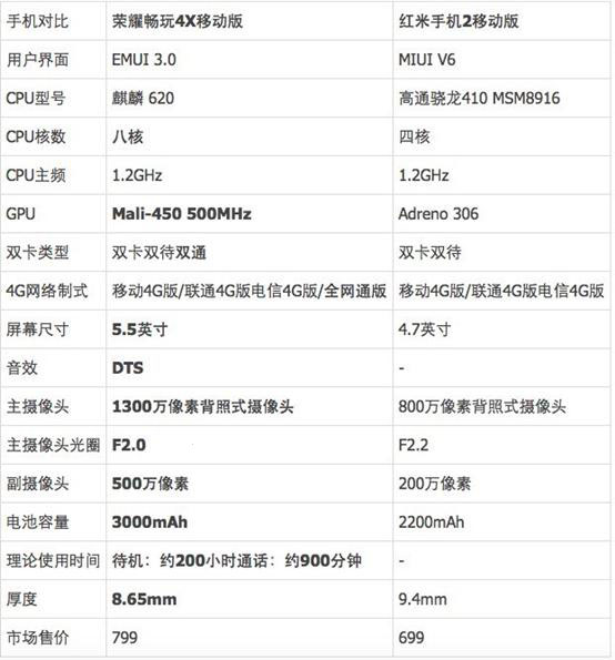 下面一起来看看荣耀畅玩4X与红米手机2的参数对比情况,如下图: