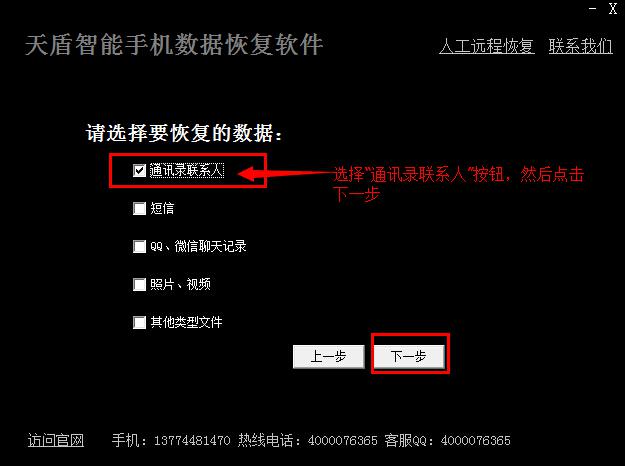 第四步:选择需要恢复的数据,这里大家需要选择“通讯录联系人”按钮,然后进行下一步。