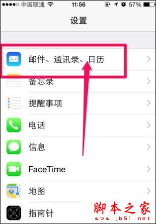 1、打开苹果iPhone6手机【设置】,点击【邮件、通讯录、日历】找到日历相关选项。