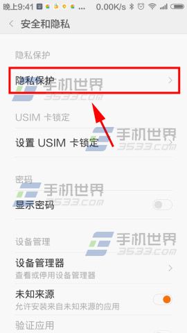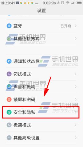 1)打开小米Note手机【设置】点击【安全和隐私】。(如下图)
