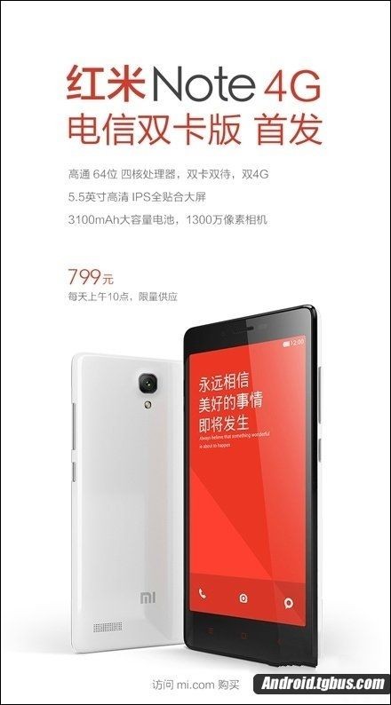 红米Note移动与联通版此前均已上市,现在终于有了电信版的消息。目前已经确定该版本手机会在于每天早上10 点现货开卖,其售价为799元,重要的是小米官网提供现货销售,所以感兴趣的朋友准备入手吧。对于苦等千元级好用的电信双卡机的朋友来说,他们的春天要来了,赶快行动吧。
