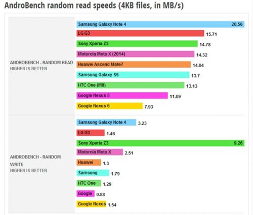 下面来看一下测试数据,在4KB随机读写测试中,读取速度最高的是三星Galaxy Note4,,其次为LG G3,Google Nexus 6最慢,最快最慢差距为3倍。