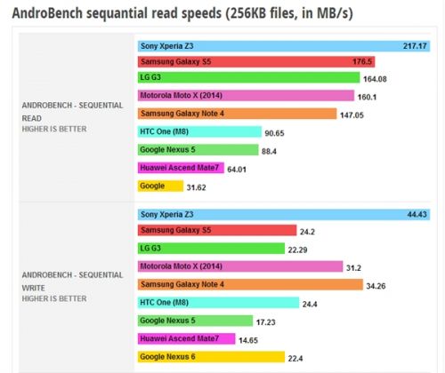 在256KB连续读写测试中,读取速度最快的是索尼Xperia Z3,最慢的依旧是Google Nexus 6,最快最慢差距达到了7倍.