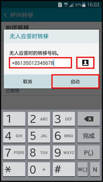 7. 输入要转移的号码(也可以点击右侧的“联系人”图标添加号码,这里以输入号码为例),然后再点击【启动】。