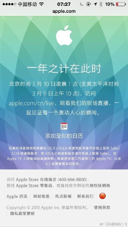 苹果发出邀请函:3月9日召开特别发布会 发布Apple Watch智能手表