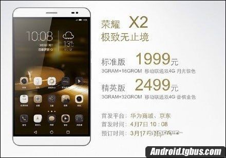 从官方的公告可以看到,荣耀X2将在3月17日10:08至4月6日18:00这一期间,在华为商城和京东商城开启预订,这一时间段内任何拥有华为商城帐号和京东商城帐号的网友,都可以登录这两个网站预订荣耀X2。