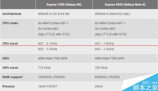 得益于制程的进步,三星能够将Exynos 7420的A57 CPU最大主频率进一步提升至2.1GHz,相比20nm工艺的Exynos 5433 A57的最大主频1.9GHz提升了200MHz,GPU的最大主频则从5433的700MHz提升到了772MHz,总体在频率上的提升在10%左右,这自然能够带来性能上的提升。