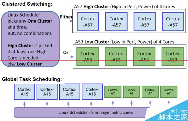 虽然ARM刚刚发布了最新的高性能CPU架构Cortex-A72,但是要想三星立刻生产出量产制品依旧是不现实的,使用A57+A53的设计来平衡功耗和性能也是很正常的做法,原则上来说后台轻度的应用会交给A53核心来处理,在需要高性能的时候,A57则会投入工作,Exynos 7420自然也是支持GTS(Global Task Scheduling),也就是八核心同时投入工作,以及动态核心电压频率调整功能。