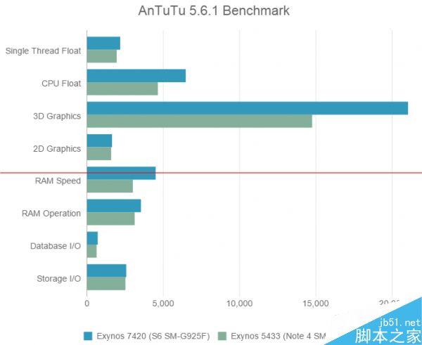使用娱乐兔对Galaxy S6和Exynos版Galaxy Note 4进行性能跑分对比时,不难发现S6在3D图形性能上远远地超过了Note 4,而二者的屏幕分辨率都是2560×1440,虽然性能跑分不一定能够完全代表实际体验,但是由此反映出来的性能提升确实是实打实的。此外,LPDDR4内存的威力也在跑分之中得以体现,至于CPU性能提升,则是意料之中的事情了——毕竟主频更高,制程更先进,这个没什么意外的。
