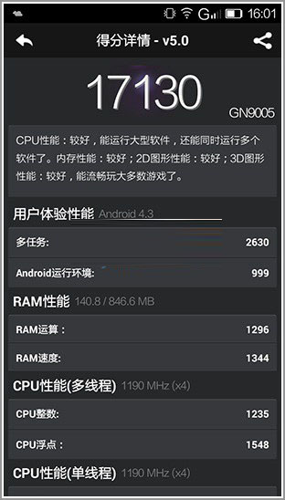 而上一代金立S5.1硬件配置相对比较老,搭载1.2Ghz高通400四核32位处理器,运行1GB内存和8GB存储空间,通过此前的安兔兔V5.0跑分测试,其跑分成绩如下图所示。