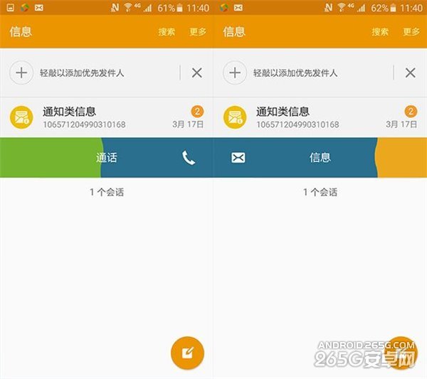 丰富的色彩和动态化的视觉效果是这代Touchwiz给我留下最深刻的印象,借由材料化为设计语言基础,三星将更多的动态效果加入了操作中来,比如点击菜单的时候,会有一个圆点从手指点击的位置像两边扩散,再比如联系人或者短信界面左右滑动快速拨打电话回短信的时候,增加了边缘的水波效果等等。