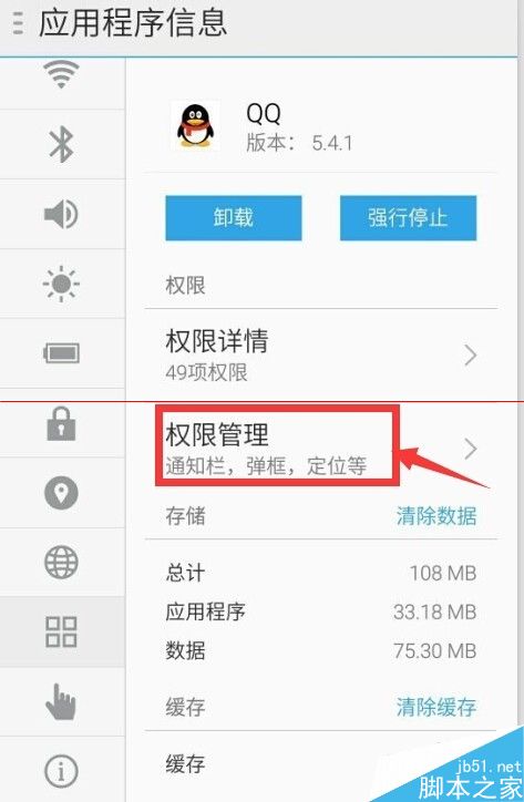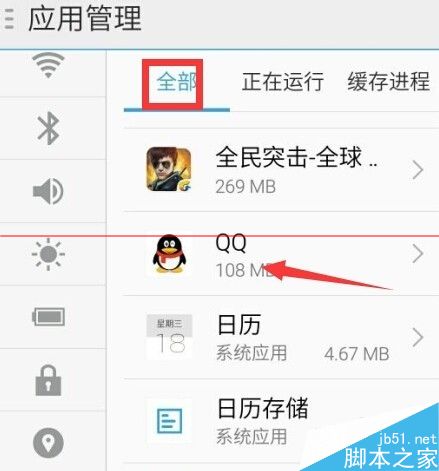 2、在设置窗口中,选择左侧导航中的“应用管理”。然后右侧全部应用中找到:QQ并点击进入;