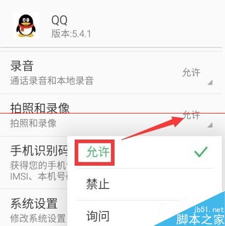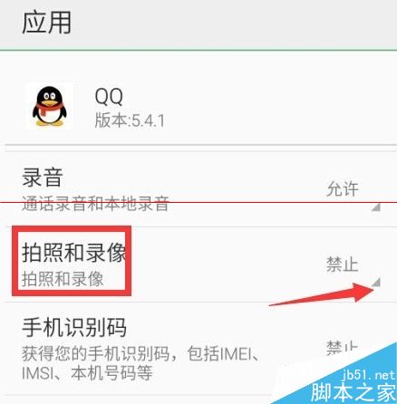 4、下拉选项直到“拍照和录像”,此时状态为禁止。点击右下黑色三角下拉菜单,选择“允许”状态。
