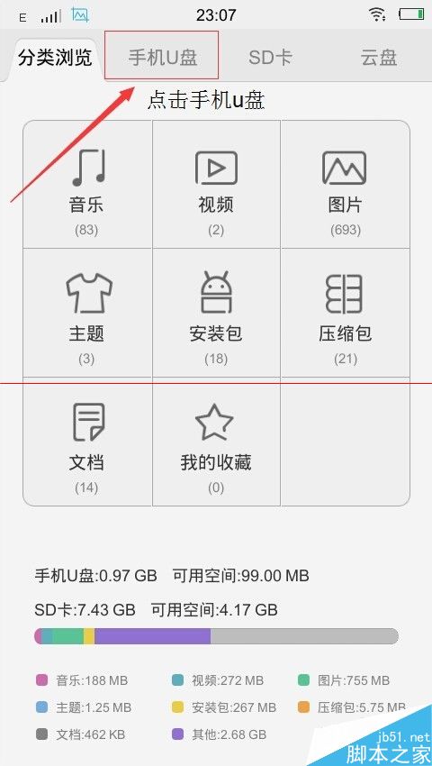 5、如果你点击了清除,相册里面是看不到截图的图片的,那么怎么找到呢 1:回到主页,2:打开文件管理,3:选择手机U盘,4:截屏