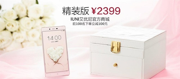 IUNI i1定位女性手机,精简版和精装版外观与硬件配置完全相同,仅仅只是包装盒设计不同,精装版很明显是精心盒装的版本,更适合作为礼物赠送,价格贵400元。
