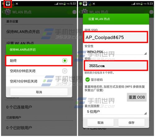 2)在WLAN热点设置中选择【始终】,接着设置【网络SSID】及密码即可。PS:小伙伴要连接的wifi名字便是网络SSID。(如下图)