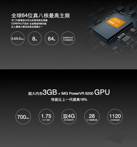 乐视超级手机1搭载联发科Helio X10手机芯片,采用64位真八核超高主频,史上最强大处理器之一;超大内存3GB+ IMG PowerVR 6200 GPU;移动联通双卡双待双4G。