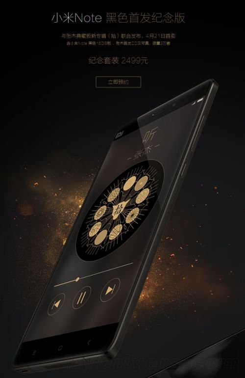 4月15日,小米联合张杰发布了小米Note黑色纪念版,售价2499元,内容包括:黑色版小米Note+张杰首发CD及140页写真+纯手工皮纹音乐礼盒。