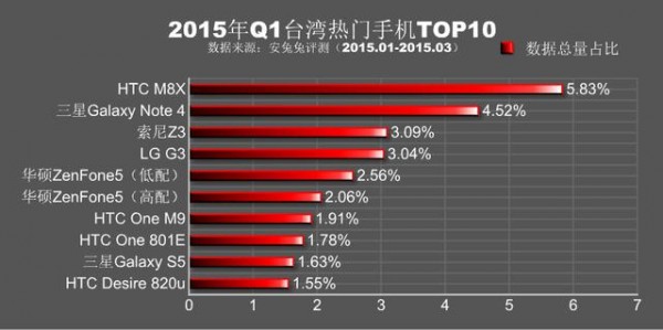 接下来是中国(注意是中国)台湾地区的数据:由于台湾地区的本土品牌非常多,因此台湾地区的热门手机主要是以本土品牌为主,日韩品牌为辅。至于我们熟悉一些大陆品牌......呵呵......多努力吧。其中HTC在台湾地区的受欢迎程度非常高,在TOP10排名中有4个HTC的产品。华硕的ZenFone5以及三星手机分别有两个产品入围。索尼的Z3以及LG G3凭借出色的外观、不俗的性能也登上了榜单。