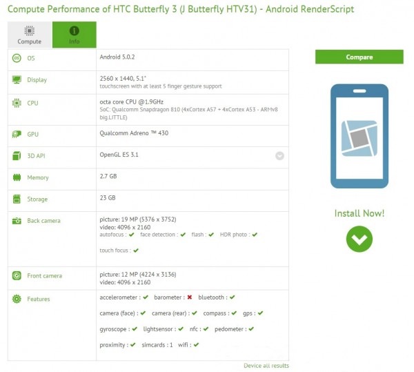 早在上个月,爆料大神@upleaks就透露了HTC Butterfly 3的一些信息,包括2K屏,白、蓝、红三种颜色等。现在,测试网站CompuBench的数据库中又出现了这款手机的身影,配置信息则是被完全“扒光”。可以看到,蝴蝶3将拥有5.1寸2K屏,配备骁龙810处理器、3GB RAM和32GB ROM,系统为Android 5.0.2。
