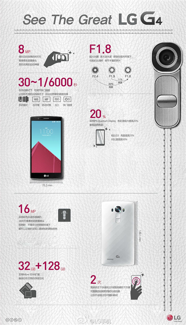 日前,LG正式发布了新一代旗舰手机G4,目前该机已经在韩国本土市场开卖,售价为825000韩元(约合人民币4785元)。LG G4的一大亮点就是采用了很特别的皮革材质后壳(植鞣革),此外还使用了目前智能手机少见的可拆卸电池。配置方面,该机采用5.5寸IPS Quantum显示面板(分辨率2560×1440,538PPI),搭载骁龙808六核处理器(GPU Adreno 418),搭配3GB LPDDR3内存+32GB机身存储(最大支持128GB microSD卡扩展)。