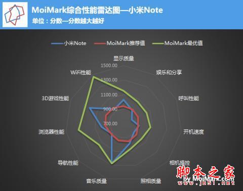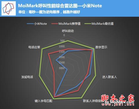 在上面的综合雷达图中,小米Note在最基础的环节——即呼叫性能的整体延时与MoiMark推荐值差距最明显,具体看客观测试结果。