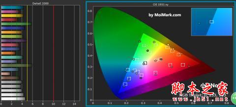 而在屏幕的色彩还原上,小米Note整体是非常不错的,从原始客观测试对色彩偏离和色域的结果上看,该机仅在绿色区域有轻微色偏,Delta E平均差值为3.93,这一数值可位列MoiMark实验室百余款主流手机前十。