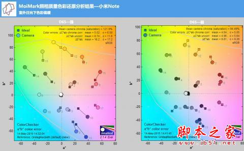 在色准方面,小米Note更注重了在弱光下色彩还原准确性,从原始客观测试数据中,该机在弱光环境下的色彩偏离很小,而在日光下,色彩更倾向红、黄区域,反映在实际成像结果,则偏暖一些。看原始客观测试结果。