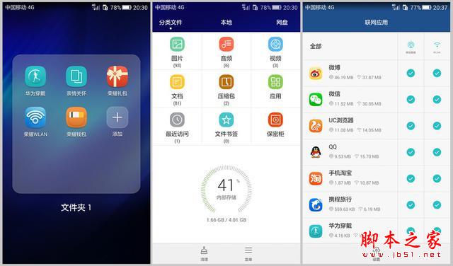 谈及EMUI3.0的优势,不得不提的是EMUI自带应用的优化和构建。类似文件管理、应用市场和权限管理等的体验,EMUI的体验会比国内大部分定制系统的会好很多。此外,荣耀4C也自带了亲情关怀体验,能远程协助同样支持此功能的手机。可以免费使用运营商的热点“荣耀WLAN”, 也是荣耀4C搭载的EMUI3.0中的一大亮点。