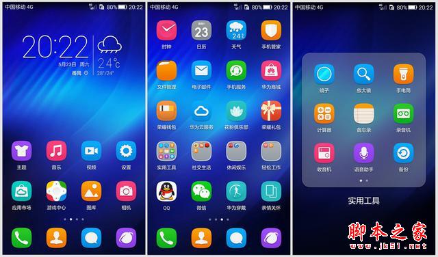 荣耀4C搭载的EMUI3.0是基于安卓4.4进行定制的,并没有吃上安卓5.0。而加持了2GB的运行内存,荣耀4C运行还算较为流畅。笔者用过大部分版本的EMUI,在EMUI不断的迭过程中,其也形成和积累了不少特色功能和标志性的界面设计。如杂志锁屏、简易桌面等均是EMUI目前特色的交互和界面设计。