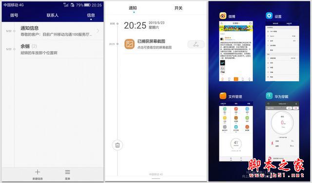 EMUI3.0的界面信息呈现的表现方式还是有不少可圈可点的也方。如多任务菜单依然采用视窗式的页面设计,下滑锁定任务,上滑清除任务。还有通知栏、通话记录和短信均以时间树的形式呈现,界面简洁直观,使用起来非常方便。此外,短信功能还会自动智能归类商家网站的通知类信息,这个功能非常实用。