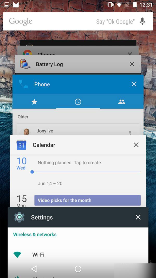 安卓5.0方面,点击主屏幕上的搜索小工具插件,可以直接在搜索条下方为你提供四个最近使用的应用程序。另外,新版安卓最重要的功能就是“Google Now On Tap”,很可惜的是,在首个开发者预览版中,该功能并无法启用。