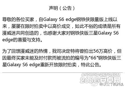 京东手机通讯表示“自Galaxy S6 edge钢铁侠限量版上线以来,屡屡在限时拍卖中以高价成交,如此不俗的成绩是所有漫威迷共同创造的,也感谢大家对钢铁侠版三星Galaxy S6 edge的喜爱与支持。”