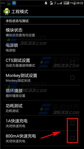 在拨号界面中输入【*20121220#】,进入工程模式,将【1A快速充电】跟【800mA快速充电】开启即可。(如下图)