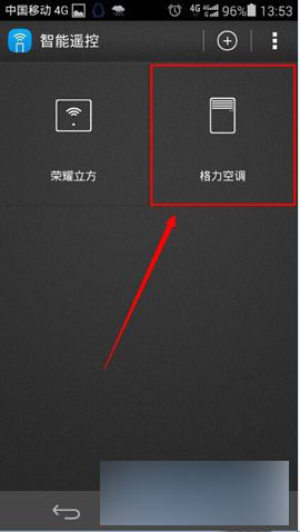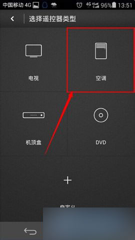 1)打开华为荣耀7【智能遥控】应用,点击右上角的【+】,选择摇控器的类型如【空调】。(如下图)
