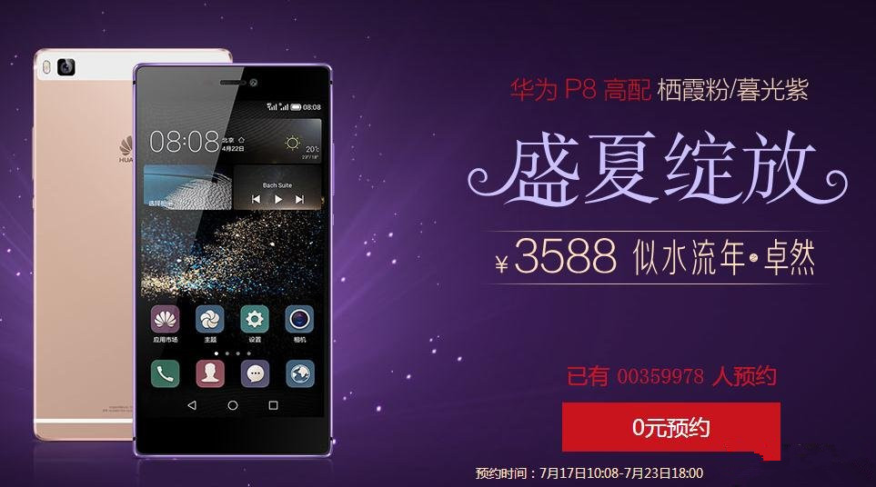 七月初,华为产品线副总裁揭锦锦表示华为P8将会推出紫色版,专为高端时尚女性用户打造,而近日华为商城也上架了华为P8高配栖霞粉与暮光紫两个版本,并开启了新机预约,将会与7月24日首发上市。下面就详情来看看了解一下吧,希望会对大家有所帮助的!