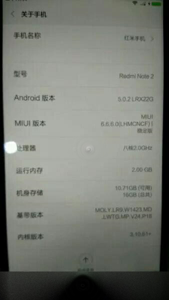 红米Note 2配置/售价/外形终极曝光,从网友的曝光来看,红米Note 2似乎没有指纹识别功能,运行系统为Android 5.0.2,内存为2GB RAM+16GB存储空间(可扩展),搭载的是2GHz的MT6795M八核处理器。