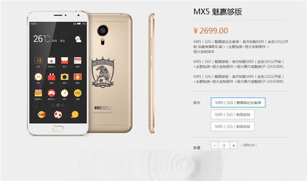 官方标配MX5金色32G公开版(后盖有激光蚀刻队徽)+主题包装+恒大定制固件+恒大定制球衣,2699元
