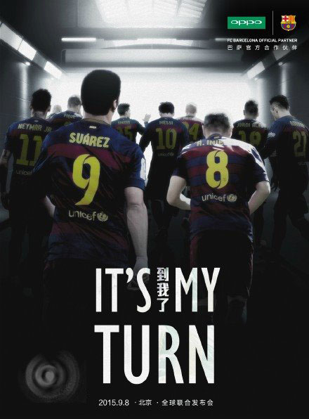 2015.9.8OPPO全球联合发布会宣传照曝光,今天上午,OPPO官微宣布,OPPO巴萨将于9月8日在北京召开联合发布会,宣传海报配以文字“到我了”“It's my turn”。
