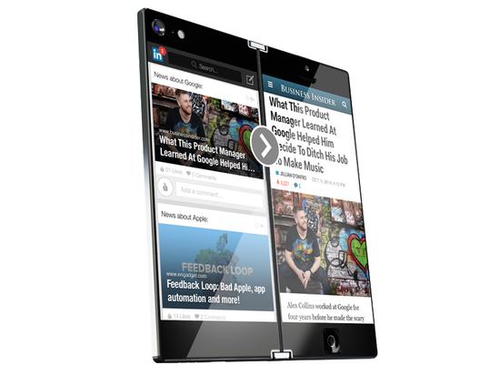 位于顶部和底部的两个铰链让两片机身可以实现 360 度的翻转。也就是说,你可以把手机扭成一块大屏幕、两面都是屏幕,或者两面都是背面。