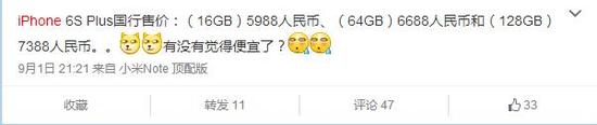 iPhone 6s/6s Plus国行售价(图片截自新浪微博)