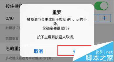 6、这时,系统将会弹出一个提醒窗口说明“触摸调节会更改用于控制iPhone的手势,确定要继续吗?”,直接点击【好】即可