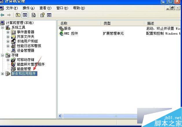 2、点击管理选项后进入到计算机管理选项窗口,在这个窗口找到并点击“服务和应用程序”;