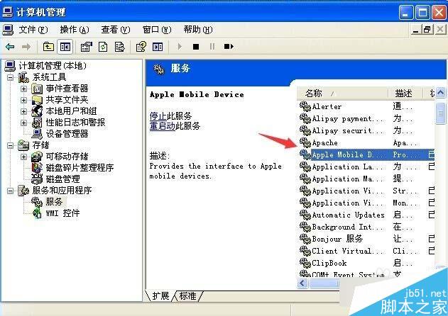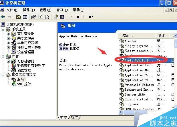 4、打开服务项后,在服务管理窗右侧的一长列选项中找到“Apple Mobile Device”;