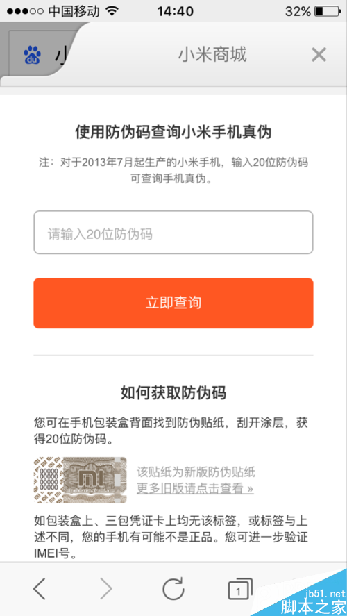 7.点击查询小米手机,输入20位阿拉伯数字的防伪码进行查询,查询结果显示为该手机为第一次激活的是正品,且不是翻新机,如显示结果为2次查询或以上,那么该手机是正品但它是翻新机来的。查询不出结果的,毫无疑问是假的。