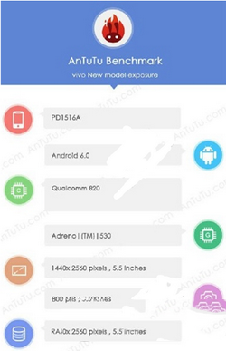 从配置信息来看,vivo这款新机将搭载高通骁龙820芯片、4GB内存、64GB机身存储、5.5英寸2K分辨率屏幕、800万像素前置摄像头、1600万像素后置摄像头、4000mAh大容量电池、运行Android 6.0系统。